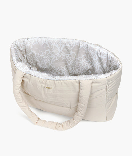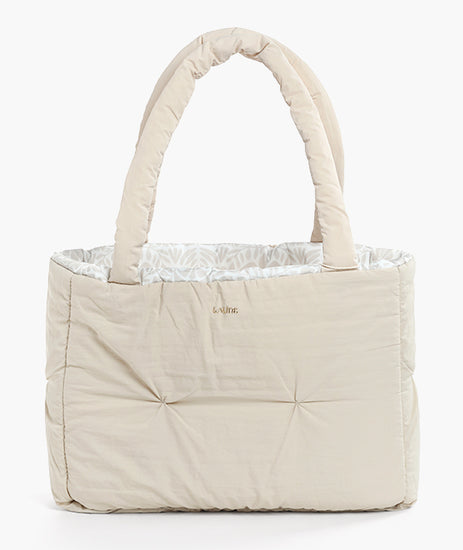 תיק בגוון בהיר עם ידיות מרופדות לנשיאה נוחה, וריפוד פנימי רך בעיטור דוגמה עדינה, שילוב מושלם בין פרקטיות לעיצוב אלגנטי.